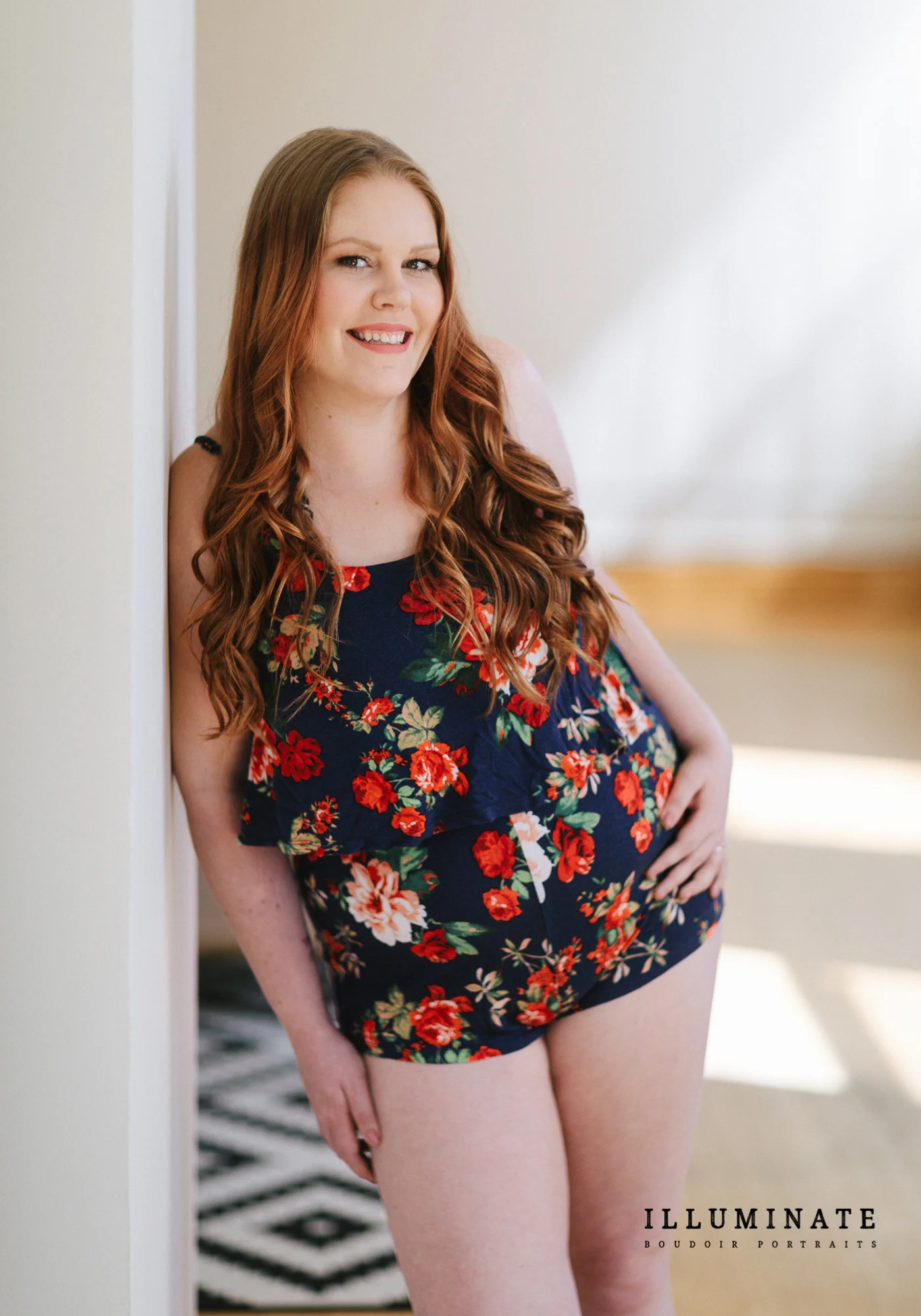 As we talked more, Rachael loved the idea of not having one super specific focus, and instead a focus of capturing these multifaceted sides of her personality. This came through in several ways during her session and especially in her outfit choices. She had a romper with a fun floral pattern in a deep navy blue color that was casual feeling, a lacey lilac bodysuit with panels and a strappy back detail, a pale pink bodysuit with some soft lace and a high neck detail with a peek-a-boo element in the front that she paired with a sheer floral robe, and a black lace bodysuit that was sheer with a deep-v in the front that she opted to wear over a black bra. This last bodysuit had some long lace sleeves and lovely texture. We also took a couple illusion portraits with her wrapped in a simple white sheet.