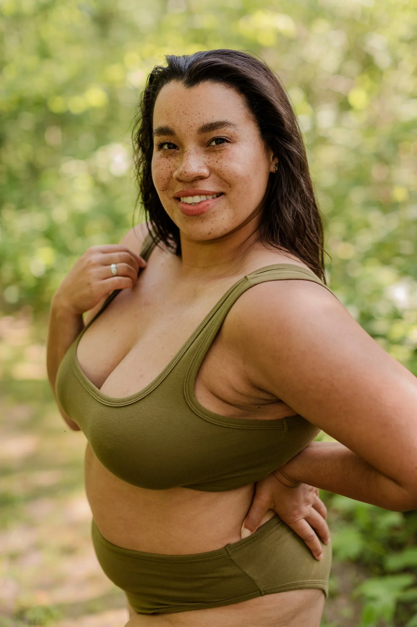 A began the session wearing an olive green cotton bralette and high waisted bottoms, which felt simple, natural, and tied in well with the forest setting. Next she wore a sheer black romper/teddy. The wide neck line highlighted her shoulders, and the soft lace detail gave this look a feminine, romantic feeling as the sunlight danced across the mesh fabric. A ended the session wearing a fitted caramel-colored bodysuit with straight, delicate straps that exuded a strong and elegant feeling. By sticking with earth tones colors but playing with different fabrics and outfit styles, A’s portraits captured the simplicity and versatility of nature.