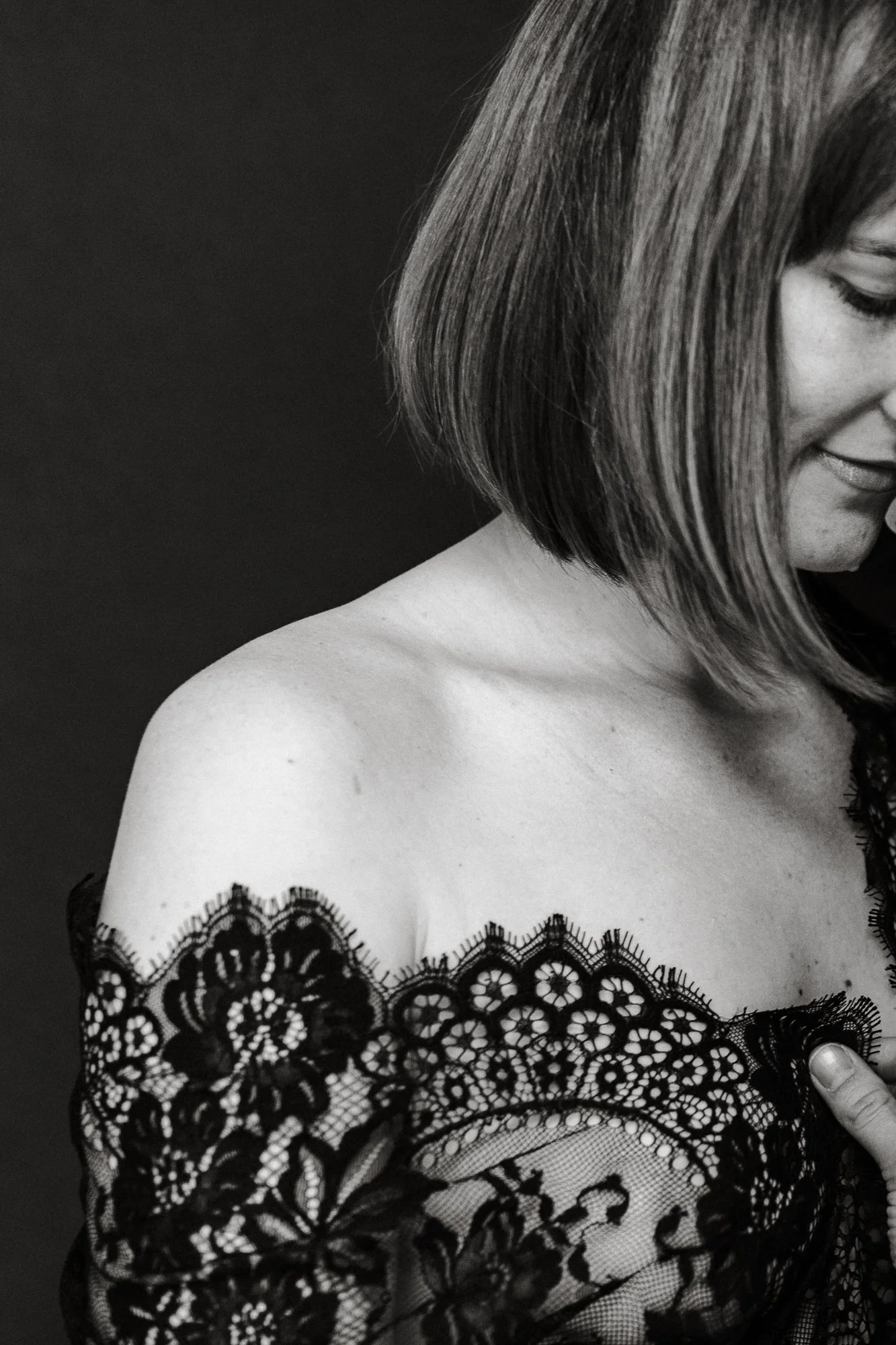 Next Hannah borrowed a black, lace robe from my studio layering wardrobe which felt dramatic, sensual, and powerful. The portraits of Hannah standing in front of my black backdrop feel striking and dramatic, while the portraits of her beside my floor-to-ceiling glass windows feel candid, sensual, and filled with self-loving joy.