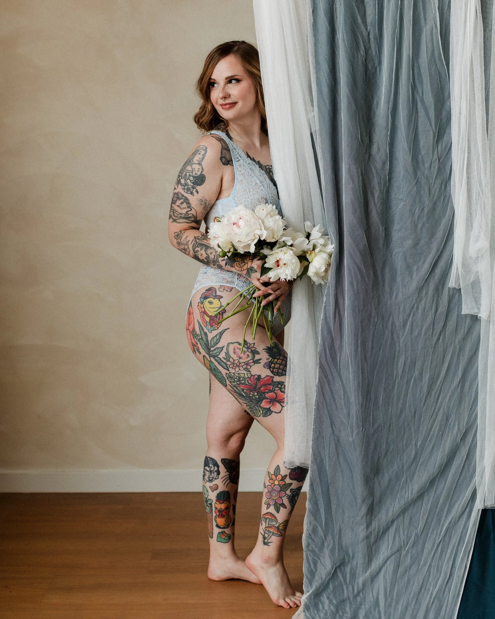 Lauren is an amazing human, with so much warmth. For her first boudoir session with me, she booked a minimalist session and afterwards she felt so excited to plan a full boudoir session for herself for the following year! When planning her second session, Lauren immediately felt drawn to my flower boudoir concept. She loves peonies and wanted her boudoir photographs to include a blend of colorful and monochromatic moments. She wanted the overall mood to feel romantic, feminine, soft, confident, and joyful.