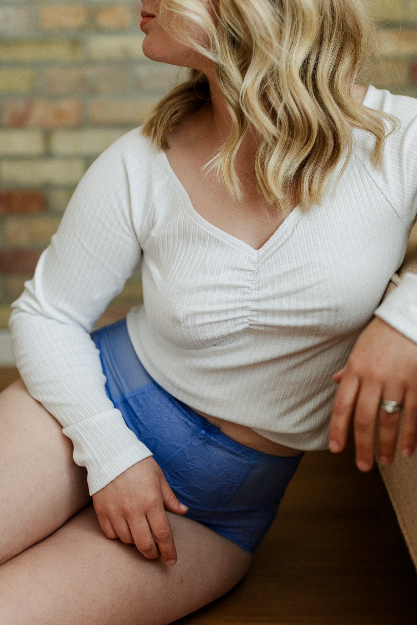 For her third look, SJ transitioned into an outfit that felt casual and comfy. She wore a long sleeve ribbed t-shirt paired with high waisted blue underwear. These portraits have cozy, weekend morning energy. After that look, SJ wore a red lace bra and underwear set that felt glamorous and fancy. I photographed her on my studio bed, where the warm color tones of the brick wall complemented her outfit beautifully.